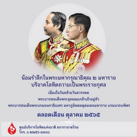 ศูนย์บริการโลหิตแห่งชาติ สภากาชาดไทย ชวนพสกนิกรชาวไทย “น้อมรำลึกในพระมหากรุณาธิคุณ 2 มหาราช” บริจาคโลหิตถวายเป็นพระราชกุศล เนื่องในวันคล้ายวันสวรรคต พระบาทสมเด็จพระจุลจอมเกล้าเจ้าอยู่หัว และพระบาทสมเด็จพระบรมชนกาธิเบศร มหาภูมิพลอดุลยเดชมหาราช บรมนาถบพิตร ตลอดเดือนตุลาคม 2565
