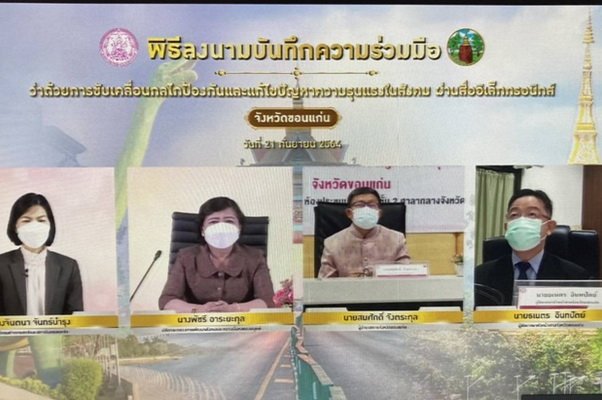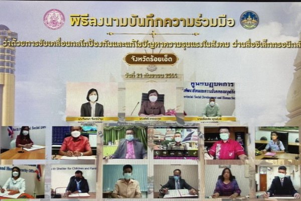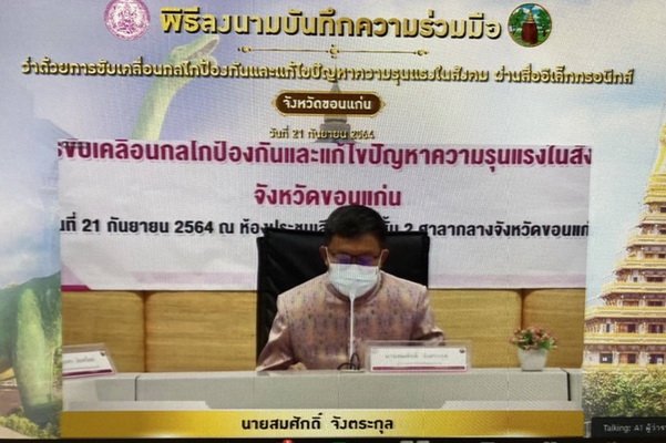 วันนี้ (21 ก.ย. 64) เวลา 09.30 น. นางพัชรี อาระยะกุล ปลัดกระทรวงการพัฒนาสังคมและความมั่นคงของมนุษย์ เป็นประธานในพิธีลงนามบันทึกความร่วมมือ (MOU) ว่าด้วยการขับเคลื่อนกลไกป้องกันและแก้ไขปัญหาความรุนแรงในสังคม นำร่อง 3 จังหวัด ได้แก่ จังหวัดชุมพร ขอนแก่น และร้อยเอ็ด รวมทั้งสิ้น 39 หน่วยงาน ผ่านสื่ออิเล็กทรอนิกส์ เพื่อสนับสนุนแนวทางการทำงานในทุกมิติสำหรับการปฏิบัติงานอย่างเป็นระบบที่ชัดเจน และส่งเสริมการบูรณาการความร่วมมือระหว่างหน่วยงานในพื้นที่ที่เกี่ยวข้องในทุกระดับ เป็นทีมสหวิชาชีพ โดยมีกรอบและข้อเสนอแนวทางการดำเนินงานกลไกขับเคลื่อนการป้องกันและแก้ไขปัญหาความรุนแรงในสังคม ตามกลยุทธ์ 5Ps ประกอบด้วย ด้านนโยบาย ด้านการดำเนินคดี ด้านการคุ้มครอง ด้านการป้องกัน และด้านความร่วมมือ