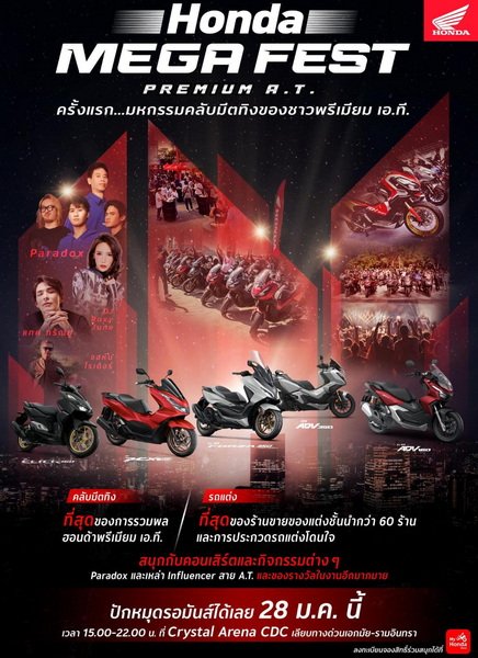 ไทยฮอนด้าเตรียมระเบิดกิจกรรม “Honda Mega Fest” ครั้งแรกของการรวมพลแบบ Mega สำหรับเหล่านักขี่ Honda Premium A.T. ทุกรุ่น ไม่ว่าจะเป็น Forza350 ADV350 ADV160 PCX160 และ Click160 มาประชันกันในงาน “Honda Mega Fest” งานแรกและงานเดียวที่รวบรวมทุกความเป็นที่สุด ไม่ว่าจะเป็นการรวมตัวกันของรถแต่งจากสำนักแต่งชื่อดัง การประกวดรถขวัญใจมหาชน การแสดงสตันท์โชว์ สเก็ตบอร์ดโชว์ สนุกไปกับดนตรีแนว EDM รวมถึงคอนเสิร์ตสุดมันส์จาก Paradox วันที่ 28 มกราคมนี้ ที่ CDC เลียบทางด่วนเอกมัย-รามอินทรา