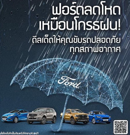 ฟอร์ดการันตีความใส่ใจด้วยการเน้นย้ำเรื่องความอุ่นใจในการใช้งานรถของลูกค้าผ่านแคมเปญ ‘ฟอร์ดลดโหดเหมือนโกรธฝน’ ที่จะช่วยให้ลูกค้ารถฟอร์ดเดินทางได้อย่างปลอดภัยในทุกเส้นทางตลอดหน้าฝนและในทุกสภาพอากาศ โดยจัดข้อเสนอด้านบริการพิเศษเพื่อความอุ่นใจ ได้แก่