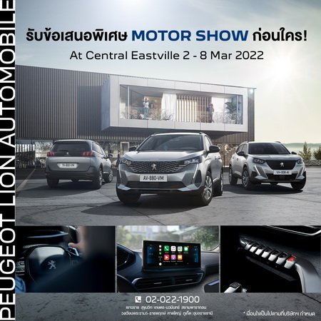 เปอโยต์ ไลอ้อน ออโตโมบิล ผู้แทนจำหน่ายรถยนต์ เปอโยต์ อย่างเป็นทางการในประเทศไทย เรียกความคึกคักกระตุ้นตลาด จัดกิจกรรมพิเศษ มอบข้อเสนอเดียวกับ มอเตอร์โชว์ ทั้งแคมเปญผ่อนสบาย, บัตรกำนัล และของขวัญแบบจัดเต็ม ระหว่างวันที่ 3-9 มีนาคม ที่ เอสบี ราชพฤกษ์ และ 5-11 มีนาคม ที่เซ็นทรัล เฟสติวัล อีสต์วิลล์ หรือรับข้อเสนอพิเศษ ที่โชว์รูม เปอโยต์ ไลอ้อน ออโตโมบิล ทุกสาขา