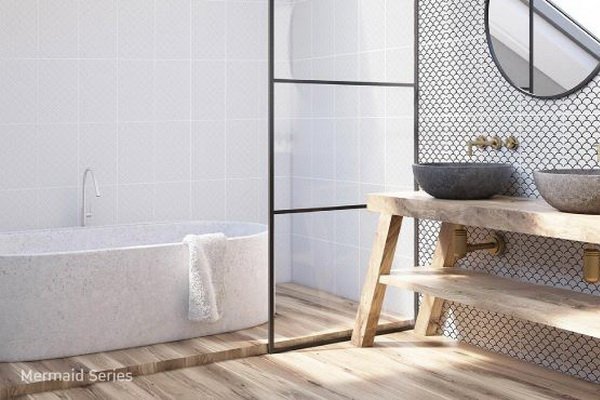 กราฟฟิกสไตล์อิงแอบธรรมชาติ กับลวดลายสุดคิ้วท์ของกระเบื้องลายเมอร์เมดซีรี่ย์ ที่เปลี่ยนกราฟฟิกจากรูปทรงสีเหลี่ยม มาเป็นลวดลายทรงโค้งมน ทำร่องลึกในเส้นดำเหมือนเกล็ดปลาบนพื้นผิวสีขาว ให้รู้สึกลื่นไหล ผ่อนคลายได้ความละมุนสบายตา เลือกใช้ตกแต่งบนผนังในด้านที่จัดวางอ่างล้างหน้า 1 ด้าน ใช้ไม้เป็นวัสดุในการทำเคาเตอร์อ่างล้างหน้า เพิ่มลูกเล่นด้วยการเลือกอ่างล้างหน้าสีดำและสีเทา เลือกพื้นห้องน้ำเป็นลายไม้ เป็นการเพิ่มเสน่ห์ให้กับห้องน้ำดูสวยแบบเซนโดดเด่นอย่างไม่ซ้ำใคร