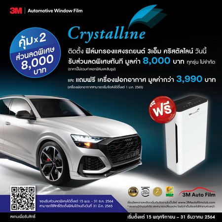 1.แคมเปญคุ้มx2 เพียงติดตั้งฟิล์มกรองแสงรถยนต์ 3เอ็ม คริสตัลไลน์ สำหรับรถยนต์ทุกรุ่นทุกยี่ห้อ ณ