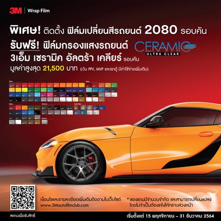 2.แคมเปญเปลี่ยน 1 ได้ถึง 2 เพียงติดตั้งฟิล์มเปลี่ยนสีรถยนต์ 3เอ็ม รุ่น 2080 รอบคัน รับฟรี!! ฟิล์มกรองแสงรถยนต์ 3เอ็ม รุ่น เซรามิค อัลตร้า เคลียร์ จำนวน 1 รางวัล ต่อ 1 การติดตั้ง มูลค่าสูงสุดถึง 21,500 บาท (จำนวนจำกัด) จองรับสิทธิ์เพื่อติดตั้งได้ทาง https://bit.ly/3mq4VM6 ตั้งแต่วันนี้ – 31 ธันวาคม 2564 โดยผู้ที่ได้รับสิทธิ์โปรโมชันต้องนำรถเข้ารับบริการ ณ ศูนย์ติดตั้งที่ 3เอ็มกำหนดเท่านั้น