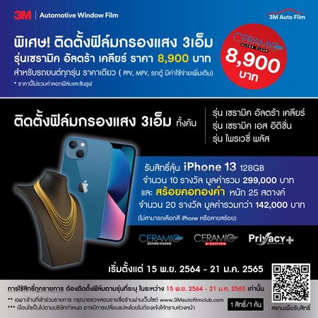 3.แคมเปญโชคสองชั้น พบกับโชคชั้นที่ 1 ติดฟิล์มกรองแสงรถยนต์ รุ่น เซรามิค อัลตร้า เคลียร์ ราคาเดียวสำหรับรถยนต์ทุกรุ่น ทุกยี่ห้อ เพียง 8,900 บาท (PPV, MPV, รถตู้ มีค่าใช้จ่ายเพิ่มเติม) ต่อด้วยโชคชั้นที่สองเมื่อติดตั้งฟิล์มกรองแสง 3เอ็ม รุ่น เซรามิค อัลตร้า เคลียร์, เซรามิค เอส อิดิชั่น หรือ ไพรเวซี่ พลัส มีสิทธิ์ลุ้นรับ iPhone13 ขนาด 128GB จำนวน 10 รางวัล มูลค่ารวม 299,000 บาท และสร้อยคอทองคำ หนัก 25 สตางค์ จำนวน 20 รางวัล มูลค่ารวมกว่า 142,000 บาท จำกัด 1 สิทธิ์ ต่อ 1 คัน ณ ร้านค้าที่ร่วมรายการ ผู้รับสิทธิ์จะต้องติดตั้งฟิล์มตามรุ่นที่ระบุ ตั้งแต่วันนี้ – 21 มกราคม 2565