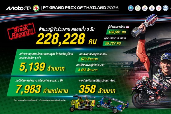 จบไปแล้วกับอีเว้นต์กีฬาสุดยิ่งใหญ่แห่งปี ศึกรถจักรยานยนต์ชิงแชมป์โลก “โมโตจีพี” รายการ “พีที กรังด์ปรีซ์ ออฟ ไทยแลนด์ 2026” (PT Grand Prix of Thailand 2026) โดยประเทศไทยเป็นเจ้าภาพ การทดสอบก่อนเปิดฤดูกาล หรือ Pre-Season Test วันที่ 21-22 ก.พ. และ สนามที่ 1 เปิดฤดูกาล ระหว่าง วันที่ 27 ก.พ. – 1 มี.ค. 2569 ที่ สนามช้าง อินเตอร์เนชั่นแนล เซอร์กิต จ.บุรีรัมย์ รัฐบาลไทย นำโดยการกีฬาแห่งประเทศไทย กระทรวงการท่องเที่ยวและกีฬาเป็นแม่งาน ผนึกกำลังกับหน่วยงานภาครัฐ-ภาคเอกชนและภาคประชาชน