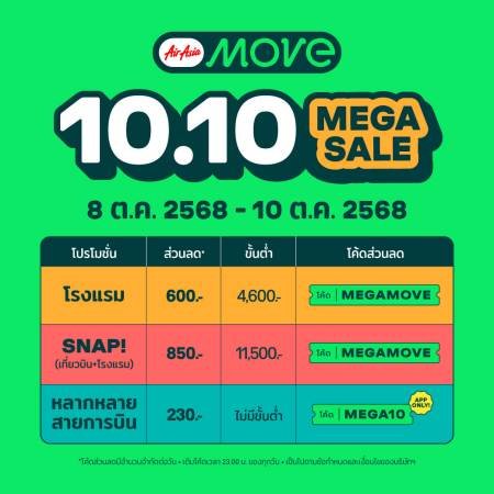 เพื่อตอบโจทย์ความต้องการเดินทางในช่วงไฮซีซัน AirAsia MOVE เปิดตัวแคมเปญ 10.10 Mega Sale ระหว่างวั 8–10 ตุลาคม 2568 พร้อมดีลพิเศษ ดังนี้:
