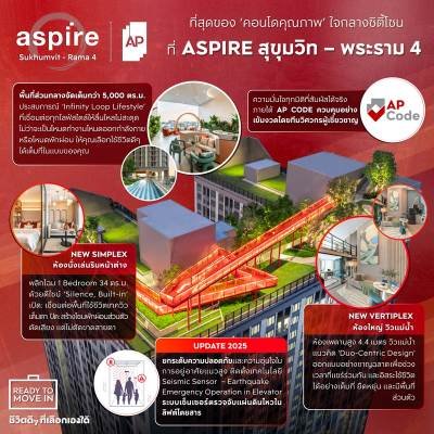 ‘ASPIRE สุขุมวิท – พระราม 4’ ไฮบริดคอนโดมิเนียม HIGH RISE ใหม่พร้อมเข้าอยู่ล่าสุด ตั้งอยู่บนที่ดินขนาด 4-3-55.8 ไร่ สูง 38 ชั้น จำนวน 1,323 ยูนิต จัดเต็มรองรับทุกช่วงเวลาของชีวิตเมือง กับพื้นที่ส่วนกลางมากถึง 5,000 ตารางเมตร เชื่อมต่อประสบการณ์การใช้งานพื้นที่ทั้งภายในและภายนอก แบบ Work – Active – Retreat ที่ไร้รอยต่อ และการออกแบบสเปซฟังก์ชันที่ใช้งานแบบ Health Infinity Loop ต่อยอดการสร้างสรรค์ให้เป็นเรื่องง่ายกว่าเดิม ด้วยไฮไลต์ส่วนกลางไฮบริด 3 ชั้น ได้แก่ ชั้น G พื้นที่สำหรับต้อนรับ สร้างปฏิสัมพันธ์ และรองรับไลฟ์สไตล์การทำงานแบบไฮบริดอย่างเต็มรูปแบบ ชั้น 8 โซนออกกำลังกายและพักผ่อนริมสระว่ายน้ำระบบน้ำเกลือความยาว Half – Olympic และ ชั้น 38 โซนชมวิวและพักผ่อนลอยฟ้าพร้อมวิวที่ดีที่สุด รับวิวโค้งน้ำบางกะเจ้าหรือวิวเมืองจากมุมสูงแบบ 360 องศา กับ The Flyover สะพานดีไซน์พิเศษในเฉดของ Crimson Red ที่เติมเต็มวิถีคนเมืองรุ่นใหม่ เป็นต้น