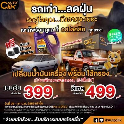 ออโตคลิก (Autoclik) ศูนย์บริการรถยนต์ Fastfit มาตรฐานสากล เดินหน้าโครงการ Green List ขานรับปัญหามลพิษทางอากาศ จัดแคมเปญใหญ่ “โปรลดฝุ่น” สนับสนุนให้ผู้ใช้รถยนต์เก่าอายุ 15 ปีขึ้นไป ตรวจเช็กสภาพเครื่องยนต์และเปลี่ยนถ่ายน้ำมันเครื่อง เพื่อลดการปล่อยควันดำและฝุ่นพิษ PM 2.5 ด้วยดีลสุดคุ้ม ลดราคากว่า 50% เริ่มต้นเพียง 399 บาท ตั้งแต่วันที่ 26 – 31 มกราคม 2569 ณ ออโตคลิก ทุกสาขาทั่วประเทศ