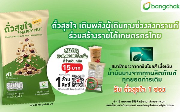 บริษัท บางจาก คอร์ปอเรชั่น จำกัด (มหาชน) ร่วมช่วยลดค่าใช้จ่ายให้ผู้บริโภคและร่วมสนับสนุนการสร้างรายได้ให้เกษตรกรไทยตามแนวทางที่ได้ดำเนินมาโดยตลอด พร้อมทั้งมอบความสุขให้แก่ผู้เดินทางช่วงสงกรานต์ โดยสมาชิกบางจากกรีนไมลส์เพียงเติมน้ำมันบางจากผลิตภัณฑ์ใดก็ได้ ทุกยอดการเติม รับฟรี ถั่วสุขใจ ขนาด 30 กรัม มูลค่า 20 บาท จำนวน 1 ซอง ตั้งแต่วันที่ 6 ถึง 16 เมษายน 2569 ที่สถานีบริการน้ำมันบางจากทั่วประเทศที่ร่วมรายการ www.bangchakmarketplace.com