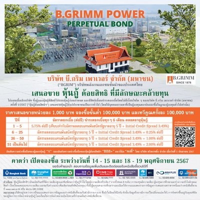 บริษัท บี.กริม เพม าเวอร์ จำกัด (มหาชน) หรือ BGRIM (“บริษัทฯ”) หนึ่งในบริษัทพลังงานเอกชนชั้นนำของประเทศไทย ที่โดดเด่นในด้านการผลิตไฟฟ้าอุตสาหกรรมและไฟฟ้าจากพลังงานทดแทนในประเทศและต่างประเทศ ประกาศอัตราดอกเบี้ยคงที่ในช่วง 5 ปีแรกของหุ้นกู้ด้อยสิทธิที่มีลักษณะคล้ายทุนฯ ครั้งที่ 1/2567 ที่ 5.75% ต่อปี โดยคาดว่าจะเสนอขายให้แก่ประชาชนเป็นการทั่วไปในระหว่าง 14-15 และ 18-19 พฤศจิกายน 2567 ผ่านสถาบันการเงินชั้นนำ 9 แห่ง ได้แก่ ธ.กรุงเทพ ธ.กรุงไทย ธ.กสิกรไทย ธ.ไทยพาณิชย์ ธ.ซีไอเอ็มบี ไทย บล.เกียรตินาคินภัทร บล.กรุงไทย เอ็กซ์สปริง บล.หยวนต้า และ บล.เอเซีย พลัส