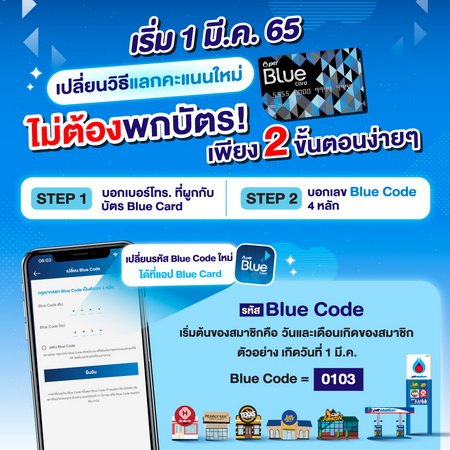 Blue Card บัตรสะสมคะแนน พร้อมความสุขหลากหลายสไตล์ในบัตรเดียว ขอแนะนำวิธีแลกคะแนนรูปแบบใหม่ไม่ต้องพกบัตร หมดปัญหาบัตรหาย บัตรชำรุด อีกทั้งยังช่วยลดการสัมผัส ตอบโจทย์กลุ่มผู้บริโภคในยุคสถานการณ์โควิด – 19 ให้สมาชิกได้แลกคะแนนเป็นส่วนลดแทนเงินสดที่ PTT Station และร้านค้าในเครือ OR ได้แก่ Café Amazon, Texas Chicken, ฮั่วเซ่งฮงติ่มซำ, จิฟฟี่ และ Pearly Tea ได้รวดเร็วกว่าเดิม สะดวกกว่าด้วยการไม่ต้องใช้บัตรสมาชิกในการแลกคะแนนอีกต่อไป เพียงแจ้งเบอร์โทรศัพท์ที่ลงทะเบียนไว้กับ Blue Card จากนั้นแจ้งรหัส Blue Code 4 หลัก โดยรหัส Blue Code เริ่มต้นของสมาชิกคือ วันเกิดและเดือนเกิดของสมาชิก เพียงเท่านี้ก็สามารถแลกคะแนนได้ทันที ส่วนสมาชิกท่านใดยังสะดวกใช้บัตร สามารถยื่นบัตร Blue Card ให้พนักงาน พร้อมแจ้งรหัส Blue Code ได้เลยเช่นกัน และสำหรับการสะสมคะแนน Blue Card นั้นยังคงสามารถแจ้งเบอร์โทรศัพท์ หรือยื่นบัตรเพื่อสะสมคะแนนได้เหมือนเดิม