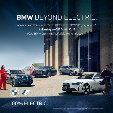 บีเอ็มดับเบิลยู ประเทศไทย ยกทัพยนตรกรรมไฟฟ้าสู่งาน BMW Beyond Electric ครั้งแรกของการรวบรวมรถยนต์ไฟฟ้าบีเอ็มดับเบิลยู ‘i’ หลากหลายรุ่นมาให้ลูกค้าได้ทดลองขับในที่เดียว สัมผัสสุดยอดเทคโนโลยีการขับเคลื่อนไฟฟ้าที่มาพร้อมสมรรถนะและความสะดวกสบาย เปิดประสบการณ์การขับขี่เหนือระดับ Sheer Driving Pleasure ตามแบบฉบับของรถยนต์บีเอ็มดับเบิลยูแบบไร้มลพิษ พร้อมเพลิดเพลินไปกับกิจกรรมและข้อเสนอสุดพิเศษจากบีเอ็มดับเบิลยู ณ ร้านอาหาร Davin Café ระหว่าง 6-9 กรกฎาคม 2566