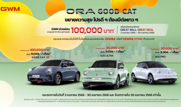 เกรท วอลล์ มอเตอร์ ในฐานะบริษัทที่ให้บริการเทคโนโลยีอัจฉริยะระดับโลก (Global Intelligent Technology Company) และผู้นำด้านยานยนต์พลังงานไฟฟ้า (xEV Leader) เอาใจแฟน ๆ น้องเหมียวอย่างต่อเนื่อง กับข้อเสนอสุดพิเศษสำหรับ ORA Good Cat GT ช่วยผ่อนนานสูงสุด 10 เดือน เดือนละ 10,000 บาท รวมมูลค่าสูงสุดถึง 100,000 บาท และ ORA Good Cat รุ่น 400 PRO และ 500 ULTRA ที่ช่วยผ่อนนานสูงสุด 6 เดือน เดือนละ 5,000 บาท รวมมูลค่าสูงสุด 30,000 บาท พร้อมยืนยันความสามารถในการส่งมอบรถด้วยจำนวนรถมากถึง 3,000 คันที่พร้อมเสิร์ฟให้กับแฟน ๆ ตั้งแต่เดือนเมษายนนี้เป็นต้นไป โดยข้อเสนอข้างต้นยังมาพร้อมกับเอกสิทธิ์เหนือระดับ ไม่ว่าจะเป็น ประกันภัยรถยนต์ชั้น 1 แพ็กเกจการบำรุงรักษาตามระยะทาง และอื่น ๆ อีกมากมาย ข้อเสนอสุดพิเศษนี้สำหรับผู้ที่สั่งจองตั้งแต่ 3 เมษายน 2566 เวลา 00.01 น. ถึง 30 เมษายน 2566 เวลา 23.59 น. เท่านั้น โดยมีรายละเอียดของสิทธิประโยชน์ดังกล่าวดังต่อไปนี้