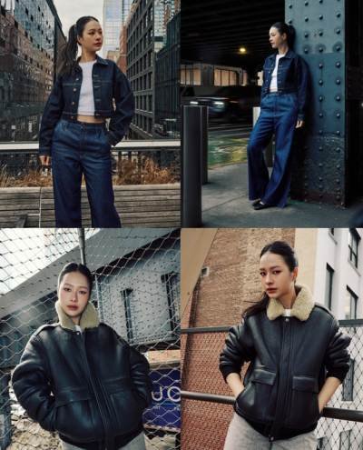 สำหรับลุคแรก มิ้ลค์เลือกสไตลิ่งที่ผสานความคลาสสิกเข้ากับความร่วมสมัยอย่างลงตัว ด้วยแจ็กเก็ตหนัง Shearling Leather Flight Jacket โดดเด่นด้วยปกเสื้อบุขนแกะ แมตช์กับกางเกงยีนส์เอวสูงขากว้างสีเทา สร้างลุคเท่ที่สะท้อนความมั่นใจอย่างมีสไตล์