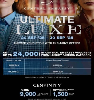 เพื่อเติมเต็มประสบการณ์ที่สมบูรณ์แบบ พบกับข้อเสนอสุดพิเศษ รับ Central Embassy Voucher รวมสูงสุด 24,000 บาท เมื่อช้อปสินค้าในหมวด Luxury Fashion ครบตามเงื่อนไข (ยกเว้น Luxury Watch & Jewelry) โดยสามารถรวมใบเสร็จจากร้านค้าที่ร่วมรายการได้ภายในวันเดียวกัน ทั้งนี้ ข้อเสนอดังกล่าวมีจำนวนจำกัดและแบ่งเป็น 2 รอบ ได้แก่ รอบแรก วันที่ 20 – 26 ก.ย. 68 และรอบที่สอง วันที่ 27 – 30 ก.ย. 68