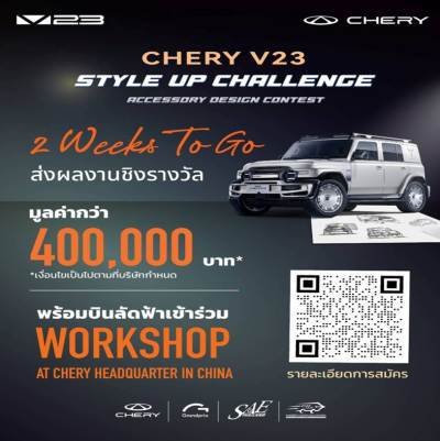 ทั้งนี้ กิจกรรม CHERY V23 Style Up Challenge เปิดรับสมัครผลงานตั้งแต่วันนี้จนถึงวันที่ 14 กุมภาพันธ์ 2569 ผู้ที่สนใจสามารถสมัครเข้าร่วมกิจกรรมได้ที่ https://www.grandprix.co.th/chery-v23-design-contest/ อย่าพลาดโอกาสร่วมเป็นส่วนหนึ่งของเวทีการออกแบบระดับโลก พร้อมติดตามรายละเอียดและภาพบรรยากาศกิจกรรม รวมถึงกิจกรรมอื่น ๆ ของเชอรี ประเทศไทย ได้ทางช่องทางประชาสัมพันธ์ของโครงการต่อไป