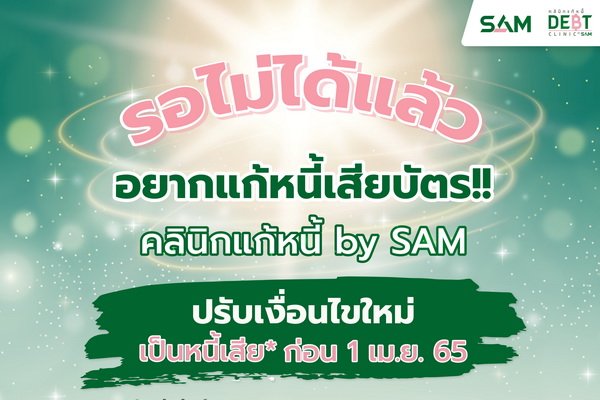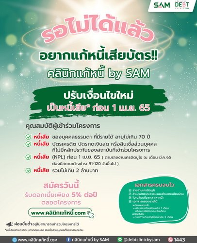 “คลินิกแก้หนี้ by SAM” ขานรับมาตรการแบงก์ชาติช่วยคนเป็นหนี้เสียบัตร ปรับเกณฑ์คุณสมบัติใหม่ให้คนที่เป็น NPL ก่อน 1 เม.ย. 65 สามารถเข้าร่วมโครงการได้ พร้อมได้รับส่วนลดดอกเบี้ยอัตราเดียวที่ 5% สนใจสมัครเข้าร่วมโครงการผ่านช่องทางออนไลน์ www.คลินิกแก้หนี้.com หรือ แอดไลน์ @debtclinicbysam และ Facebook คลินิกแก้หนี้ by SAM