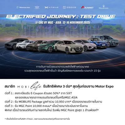 บริษัท มิลเลนเนียม กรุ๊ป คอร์ปอเรชั่น (เอเชีย) จำกัด (มหาชน) หรือ MGC-ASIA ผู้นำธุรกิจไลฟ์สไตล์โมบิลิตี้ครบวงจร จัดกิจกรรมเพื่อผู้ชื่นชอบรถยนต์ไฟฟ้าโดยเฉพาะ กับงาน ‘Electrified Journey by MGC-ASIA’ ยกทัพยนตรกรรมไฟฟ้าระดับพรีเมียมลักชัวรี่ในเครือฯ และแบรนด์พันธมิตร รวม 7 แบรนด์ มากกว่า 15 รุ่น มาจัดแสดง พร้อมเปิดโอกาสให้สัมผัสและทดลองขับในสนามเฉพาะกิจ มาพร้อมข้อเสนอสุดพิเศษทุกรุ่น ระหว่าง 12-16 พฤศจิกายน 2568 ที่ คริสตัล ดีไซน์ เซ็นเตอร์ (CDC) เลียบทางด่วนเอกมัย-รามอินทรา