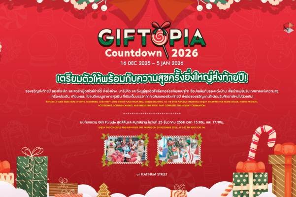 ศูนย์การค้าแพลทินัม ชวนร่วมงาน “GIFTOPIA Countdown 2026” ตั้งแต่วันนี้ถึง 5 มกราคม 2569 สัมผัสบรรยากาศแห่งความสุขด้วยการยกขบวนของขวัญ ของฝาก มาให้เลือกช้อปอย่างจุใจ ทั้งของที่ระลึก ของตกแต่งบ้าน เสื้อผ้าแฟชั่น เครื่องประดับ พร้อมอิ่มอร่อยกับสตรีทฟู้ดสไตล์ปาร์ตี้ อาทิ บาร์บีคิวปิ้งย่าง เมนูสารพัดยำ ปลาหมึก – กุ้งชุบแป้งทอด ถั่วถอด ขนมหวาน ผลไม้สดและแปรรูปอีกมากมายชมขบวน Gift Parade สุดสนุก ในวันที่ 25 ธันวาคม 2568 เวลา 15.30 น. และ 17.30 น. บริเวณ Platinum Street