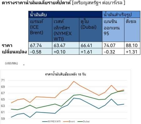 ปตท. เผยการวิเคราะห์สถานการณ์ตลาดน้ำมัน สัปดาห์วันที่ 9-13 ก.พ. 69 และแนวโน้มสัปดาห์วันที่ 16-20 ก.พ. 69 โดยตลาดน้ำมันสำเร็จรูปเบรนท์ (ICE Brent) ราคา 67.74 เหรียญสหรัฐฯ ต่อ บาร์เรล ปรับเพิ่มขึ้น -0.58 ตลาดน้ำมันสำเร็จรูปของ เวสท์เท็กซัสฯ (NYMEX WTI) ราคา 63.47เหรียญสหรัฐฯ ต่อ บาร์เรล ปรับลดลง +0.10 เหรียฐสหรัฐฯ ตลาดน้ำมันสำเร็จรูปดูไบ (Dubai) ราคา 66.41 เหรียญสหรัฐฯ ต่อ บาร์เรล ปรับราคาเพิ่มขึ้น +1.61 ขณะที่ราคาน้ำมันสำเร็จรูปซื้อซื้อขายล่วงหน้าที่สิงคโปร์ ราคาเบนซินออกเทน 95 ปรับราคาลดลง -0.32เหรียญ สหรัฐฯ มาเป็นราคา 74.07 เหรียญ สหรัฐฯ ราคาน้ำมันดีเซลราคาปรับราคาเพิ่มขึ้น +1.31เหรียญ สหรัฐฯ มาเป็นราคา 88.10 เหรียญสหรัฐฯ