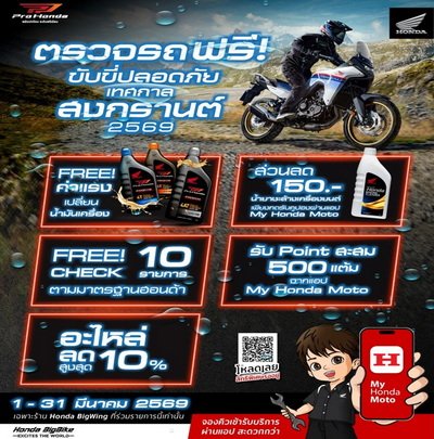 ฮอนด้าบิ๊กไบค์ ตอกย้ำความสำคัญของการขับขี่ปลอดภัย ต้อนรับเทศกาลสงกรานต์ 2569 ด้วยแคมเปญ “ตรวจรถฟรี ขับขี่ปลอดภัย” มอบบริการตรวจเช็กสภาพรถฟรีพร้อมสิทธิพิเศษสำหรับผู้ขับขี่ Honda BigBike เพื่อเตรียมความพร้อมของรถก่อนออกเดินทางในช่วงวันหยุดยาว ตั้งแต่วันนี้ – 31 มีนาคม 2569 ผู้ขับขี่ Honda BigBike สามารถนำรถเข้ารับบริการได้ที่ Honda BigWing ทั่วประเทศ พร้อมรับสิทธิพิเศษตามเงื่อนไขที่กำหนด