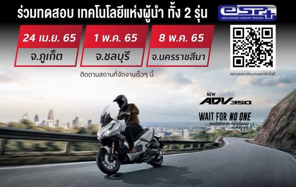 รถจักรยานยนต์ฮอนด้า เปิดโอกาสให้ผู้ที่สนใจ All New Click160 และ New ADV350 ได้ลองขับขี่ทดสอบรถคันจริงด้วยตัวเอง เพื่อพิสูจน์ความเป็นสุดยอดรถเอ.ที. ที่มาพร้อมขุมพลังจากเครื่องยนต์ eSP+ 4 วาล์ว และเทคโนโลยีอันล้ำสมัย ตอบโจทย์คนรุ่นใหม่ โดยกิจกรรมขับขี่ทดสอบจะมีขึ้นทุกภูมิภาคทั่วประเทศ เริ่มต้นจาก 3 จังหวัดใหญ่ ตามกำหนดการดังต่อไปนี้