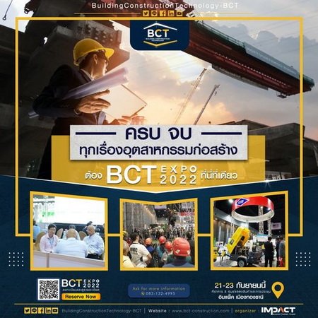 ตอบรับอุตสาหกรรมเครื่องมือก่อสร้างไทยเติบโตคิดเป็น 6.34% จากแผนการลงทุนในอุตสาหกรรมก่อสร้างและการขนส่งที่มีต่อเนื่อง อิมแพ็ค ร่วมกับพันธมิตรธุรกิจ เดินหน้าเตรียมจัดงานแสดงสินค้าเจรจาธุรกิจเพื่ออุตสาหกรรมเทคโนโลยี ก่อสร้าง อาคาร ยิ่งใหญ่ที่สุดในอาเซียน Building Construction Technology Expo 2022 หรือ BCT Expo 2022 บนพื้นที่จริงหลังสถานการณ์โควิด-19 ส่งสัญญาณดีขึ้น โดยความร่วมมือภาครัฐ-เอกชน จัดงานระหว่าง 21-23 กันยายน 2565 ณ อาคาร 8 อิมแพ็ค เมืองทองธานี