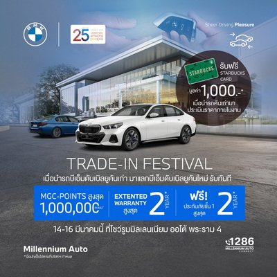 มาสเตอร์ เซอร์ทิฟายด์ ยูสคาร์ ศูนย์รวมรถยนต์มือสองครบวงจร ภายใต้บริษัท มิลเลนเนียม กรุ๊ป คอร์ปอเรชั่น (เอเชีย) จำกัด (มหาชน) ร่วมมือกับ มิลเลนเนียม ออโต้ กรุ๊ป ขอเชิญผู้ที่กำลังสนใจยนตรกรรม บีเอ็มดับเบิลยู นำรถยนต์คันเดิม มาเปลี่ยนเป็น บีเอ็มดับเบิลยู คันใหม่ พร้อมรับ MGC POINT สูงสุด 1,000,000 คะแนน ภายในงาน ‘Trade-in Festival’ ระหว่าง 14-16 มีนาคมนี้ ที่โชว์รูม บีเอ็มดับเบิลยู มิลเลนเนียม ออโต้ พระราม 4 และไอคอนสยาม