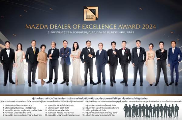 มาสด้ามาสด้า เซลส์ (ประเทศไทย) จัดงาน Mazda Dealer of Excellence Awards 2024 เพื่อเชิดชูความสำเร็จของผู้จำหน่ายที่มีผลกาดำเนินงานยอดเยี่ยมตลอดปี 2567 ภายใต้ธีม “Driven to Distinction ขับเคลื่อนสู่ความเป็นหนึ่ง ด้วยความแตกต่างเหนือระดับ” ถ่ายทอดความเป็นเลิศอันเกิดจากการร่วมแรงร่วมใจเป็นหนึ่งเดียวกัน ตั้งมั่นด้วยปณิธานอันแน่วแน่คือการส่งมอบประสบการณ์ที่ดีที่สุดให้กับลูกค้า พร้อมมอบรางวัลทีมงานฝ่ายขายและฝ่ายบริการยอดเยี่ยมแห่งปี หรือ Mazda Guild Sales and Servies Awards 2024 ให้กับทีมงานของผู้จำหน่ายที่มีผลการดำเนินงานดีที่สุดตลอดปีที่ผ่านมา เพื่อสร้างขวัญกำลังใจ และแทนคำขอบคุณที่เป็นกำลังสำคัญในการขับเคลื่อนธุรกิจ ด้วยการส่งมอบการบริการที่เป็นเลิศให้กับลูกค้ามาสด้าในประเทศไทย โดยงานฯ จัดขึ้นที่โรงแรม โฟร์ซีซั่นส์ ริมแม่น้ำเจ้าพระยา กรุงเทพฯ เมื่อเร็ว ๆ นี้