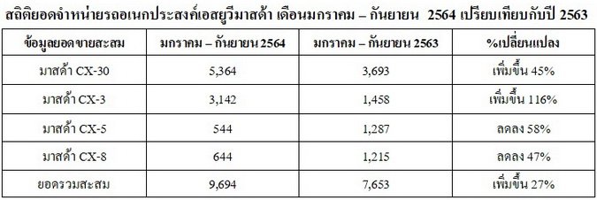 “ในขณะที่ยอดการจำหน่ายรถยนต์มาสด้านับตั้งแต่เดือนมกราคมจนถึงเดือนกันยายน 2564 มีจำนวนทั้งสิ้นประมาณ 25,800 คัน ลดลงเล็กน้อยเพียง 1% จากตัวเลข 26,000 คัน ซึ่งสถานการณ์ในปีนี้ถือเป็นความท้าทายอย่างยิ่งที่ต้องประคับประคองธุรกิจให้เดินหน้าก้าวผ่านวิกฤตโควิด-19 ไปให้ได้ โดยเฉพาะการทำงานระบบหลังบ้านให้พร้อมรองรับการเปลี่ยนแปลงไปสู่ระบบดิจิทัล ซึ่งผลลัพธ์ถือว่าเป็นที่น่าพอใจอย่างยิ่ง หลังจากนี้ไปมาสด้าจะเดินหน้าอย่างเต็มรูปแบบโดยเฉพาะแผนการเปิดตัวรถยนต์รุ่นใหม่เข้าสู่ตลาดให้ครบทุกเซ็กเมนต์ ซึ่งผมมั่นใจอย่างยิ่งว่าการปรับกลยุทธ์สำหรับการแนะนำมาสด้า CX-5 ใหม่ ในครั้งนี้ จะเข้ามาเติมเต็มความต้องการของลูกค้าให้สมบูรณ์แบบยิ่งขึ้น กลายเป็นโมเดลหลักสำคัญที่จะสร้างยอดขายให้กับมาสด้าในช่วงไตรมาสสุดท้ายของปีนี้ ผลักดันให้มาสด้าก้าวสู่เป้าจำหน่ายของปีงบประมาณ 2564 ได้อย่างแน่นอน”