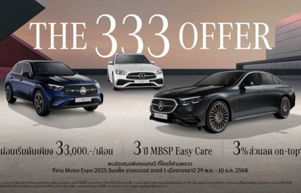 ตัวเลข 333 จึงกลายเป็นแคมเปญโปรโมชั่นล่าสุดของเมอร์เซเดส-เบนซ์ ที่มีชื่อว่า “The 333 Offer” รับกระแสงาน Motor Expo 2025 ด้วยข้อเสนอแห่งปีสำหรับยนตรกรรมปลั๊กอินไฮบริดทั้ง 3 รุ่น นำโดย E 350 e AMG Dynamic, GLC 350 e 4MATIC AMG Dynamic และ C 350 e AMG Dynamic ที่จะมอบความคุ้มค่าแบบ 3-3-3 ประกอบไปด้วยข้อเสนอการผ่อนเริ่มต้นเพียง 33,000 ต่อเดือน* โปรแกรม MBSP Easy Care ฟรี 3 ปี* และส่วนลดพิเศษ 3% On-Top* นอกจากนี้ทุกคนจะได้พบกับโมเดลสุดพิเศษ 3 รุ่นที่ไม่เคยจัดแสดงที่ไหนมาก่อน ไม่ว่าจะเป็น The new CLA, G 450 d STRONGER THAN THE 1980s และ GLA 200 Night Edition เป็นครั้งแรกในงาน Motor Expo 2025 ตั้งแต่วันที่ 29 พฤศจิกายน – 10 ธันวาคม 2568 ณ บูธหมายเลข “A02” อิมแพ็ค ชาเลนเจอร์ ฮอลล์ 1 เมืองทองธานี