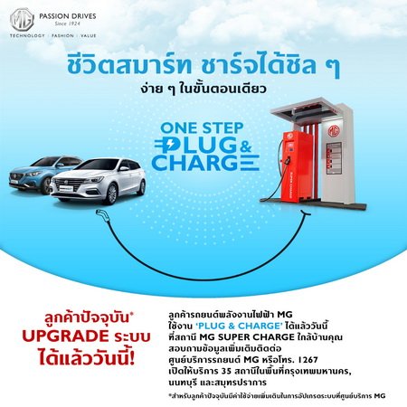 สำหรับลูกค้าที่เป็นเจ้าของรถ MG ZS EV และ MG EP ก็สามารถใช้งาน “PLUG AND CHARGE” ได้เพียงนำรถเข้าไปที่ศูนย์บริการเอ็มจี ทั่วประเทศ เพื่ออัพเดทฟังก์ชัน และเติมเงินใน MG WALLET ให้เพียงพอสำหรับการชาร์จ ปัจจุบันมีสถานี MG SUPER CHARGE ที่รองรับระบบแล้ว 35 แห่งในกรุงเทพฯ นนทบุรี และสมุทรปราการ ในอนาคตทาง บริษัทฯ มีแผนอัพเกรดสถานีให้ครอบคลุมครบทุกสถานีภายในปีนี้