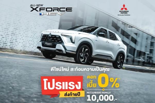 “โปรแรง ส่งท้ายปี” สำหรับลูกค้าที่ซื้อรถยนต์ ออล-นิว มิตซูบิชิ เอ็กซ์ฟอร์ส เอชอีวี ตั้งแต่วันที่ 1 พฤศจิกายน 2568 – 11 ธันวาคม 2568 เลือกรับดอกเบี้ยพิเศษ 0% นาน 48 เดือน สำหรับรุ่น Ultimate และ Ultimate X พร้อมรับฟรี ประกันภัยชั้นหนึ่ง นาน 1 ปี มูลค่าสูงสุด 22,000 บาท และเลือกรับ แพ็กเกจบำรุงรักษา Mitsubishi Service Package นาน 5 ปี หรือ 100,000 กิโลเมตร (แล้วแต่ระยะใดถึงก่อน) มูลค่าสูงสุด 21,050 บาท พร้อมบริการช่วยเหลือฉุกเฉิน 24 ชั่วโมง นาน 5 ปี มูลค่า 8,950 บาท และการรับประกันคุณภาพรถยนต์ นาน 5 ปี หรือ 100,000 กิโลเมตร (แล้วแต่ระยะใดถึงก่อน) พร้อมรับฟรี ค่าแรงเช็กระยะนาน 5 ปี นอกจากนี้ ลูกค้าจะได้รับสิทธิพิเศษ  รับฟรี ประกันแบตเตอรี่ขับเคลื่อนไฮบริด 10 ปี (มูลค่าแบตเตอรี่ 88,000 บาท) ไม่จำกัดระยะทาง และประกันระบบไฮบริด 5 ปี ไม่จำกัดระยะทาง เพื่อความอุ่นใจในการขับขี่อย่างเหนือระดับ ทั้งนี้ ลูกค้าที่เป็นสมาชิกครอบครัวมิตซูบิชิจะได้รับส่วนลดเพิ่ม 10,000 บาท ผ่านแอปพลิเคชัน M-Drive ส่วนกลุ่มอาชีพพิเศษ ได้แก่ บุคลากรทางการแพทย์ ครู ข้าราชการ และเกษตรกร รับส่วนลดเพิ่ม 15,000 บาท