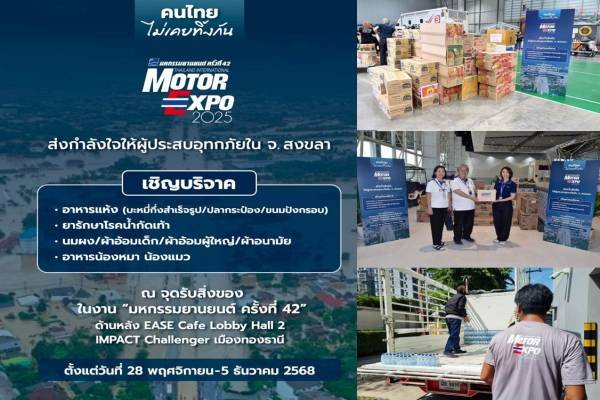 “IMC สื่อสากล” ผู้จัดงาน “มหกรรมยานยนต์” หรือ Motor Expo 2025 เปิดให้ผู้ชมงาน และประชาชนทั่วไปนำอาหารแห้ง สิ่งของเครื่องใช้มาบริจาค ภายในงาน “มหกรรมยานยนต์ ครั้งที่ 42” เพื่อรวบรวมส่งผ่าน Thai PBS ไปช่วยผู้ประสบภัยน้ำท่วมภาคใต้