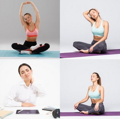 เริ่มด้วยท่าที่หนึ่งกับการบริหารกล้ามเนื้อช่วงคอ โดยนั่งหลังตรง โน้มศีรษะไปด้านหน้าเล็กน้อย และหมุนออกด้านขวาช้า ๆ ค้างไว้ประมาณ 10 วินาที และทำเหมือนเดิมในด้านซ้าย ด้านละ 3 ครั้ง ต่อไปเป็นการยืดคอด้านข้างด้วยการหันหน้าไปทางขวาค้างไว้ 10 วินาทีและทำแบบเดิมกับด้านซ้าย ทั้งสองท่าจะช่วยคลายความตึงที่คอและเพิ่มความยืดหยุ่นให้กระดูกสันหลังส่วนบน