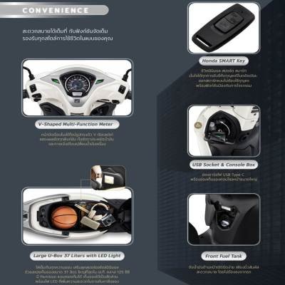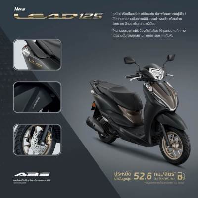 ด้านสมรรถนะ New Honda LEAD125 เพิ่มระบบเบรก ABS ช่วยป้องกันล้อล็อกขณะเบรกกะทันหัน เพิ่มความมั่นใจและความปลอดภัยในการขับขี่ สนุกเร่งความแรงได้ดั่งใจ ด้วยเครื่องยนต์ eSP+ 125 ซีซี 4 วาล์ว และประหยัดน้ำมันสูงถึง 52.6 กม./ลิตร มาพร้อมฟังก์ชันจัดเต็มเพิ่มความสะดวกสบายรองรับทุกสไตล์การใช้ชีวิต ไม่ว่าจะเป็น Honda SMART Key กุญแจรีโมตอัจฉริยะ, หน้าจอเรือนไมล์ V-Shaped Multi-Function Meter ดีไซน์รูปทรงตัว V เรียบเท่ แสดงผลชัดทุกฟังก์ชัน ทั้งอัตราประหยัดน้ำมัน และการแจ้งเตือนเปลี่ยนน้ำมันเครื่อง, ช่องชาร์จ USB Socket พร้อม Console Box สำหรับจัดเก็บของใช้จำเป็น, เติมน้ำมันได้สะดวกด้วย Front Fuel Tank ถังน้ำมันด้านหน้า รวมถึงจุดเด่นอย่าง Large U-Box ขนาดใหญ่ 37 ลิตร พร้อมไฟ LED ใต้เบาะ รองรับการใช้งานในเมืองได้อย่างมั่นใจและครบครัน