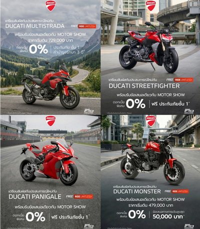 ผู้ที่สนใจสามารถสัมผัสรถ Ducati ครบทุก Model Range พร้อมทดลองนั่งและรับคำแนะนำจากผู้เชี่ยวชาญ รวมถึงจองรถและรับข้อเสนอพิเศษได้ที่บูธ ดูคาติ ประเทศไทย ภายในงาน Bangkok International Motor Show 2026 ณ อาคารชาเลนเจอร์ อิมแพ็ค เมืองทองธานี ระหว่าง 25 มีนาคม – 5 เมษายน 2569 หรือสอบถามข้อมูลเพิ่มเติมได้ที่โชว์รูม Ducati ทุกสาขาทั่วประเทศ รวมถึงช่องทางออนไลน์ เว็บไซต์: www.ducati.com/th Facebook: Ducati Thailand LINE Official: @ducatithailand