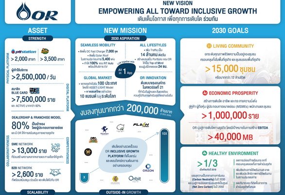 นางสาวจิราพร เปิดเผยว่า เพื่อตอบสนองการเปลี่ยนแปลงทางเทคโนโลยีที่เกิดขึ้นอย่างรวดเร็ว การเปลี่ยนแปลงของโครงสร้างทางสังคมและเศรษฐกิจ การเปลี่ยนแปลงทางด้านภูมิอากาศ นำไปสู่การเปลี่ยนแปลงวิถีในการดำเนินชีวิตและพฤติกรรมของผู้บริโภค ซึ่งให้ความสำคัญต่อสุขอนามัยและความปลอดภัย การใช้พลังงานสะอาด และปัญหาสังคมอย่างเรื่องความเหลื่อมล้ำ OR จึงได้ปรับทิศทางในการขับเคลื่อนธุรกิจ และตอกย้ำถึงเจตจำนง (Purpose) ในการสร้างการเติบโตของธุรกิจควบคู่ไปกับการเติบโตของผู้คนและสิ่งแวดล้อม และได้กำหนดวิสัยทัศน์ใหม่ คือ “เติมเต็มโอกาส เพื่อทุกการเติบโต ร่วมกัน” หรือ “Empowering All Toward Inclusive Growth” จะเป็นทิศทางในการดำเนินธุรกิจของ OR รวมทั้งตั้งเป้าหมายในปี 2030 หรือ OR 2030 Goals ใน 3 ด้าน คือ