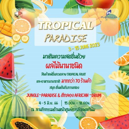 ศูนย์การค้าแพลทินัม เชิญชวนมาช้อป เติมความสดชื่นในงาน “TROPICAL PARADISE” ยกขบวนผลไม้เมืองร้อนนานาชนิด อาทิ ทุเรียน มังคุด สับปะรด เงาะ ตลอดจนผลไม้แปรรูปอีกมากมาย