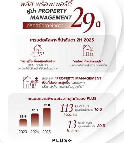 โดยครึ่งปีแรกนี้ พลัสฯ สามารถคว้าคะแนนความพึงพอใจของลูกค้าได้สูงถึง 90.8% เพิ่มขึ้นจากปี 67 ที่ได้คะแนน 90.1% และปี 66 ที่ได้คะแนน 89.4% สะท้อนถึงการรับฟังเสียงของลูกค้าและนำมาพัฒนาบริการได้จริง โดยมิติการบริการที่ลูกค้าให้คะแนนพึงพอใจสูงสุด 3 อันดับแรก ได้แก่ การบริการของพนักงาน การให้ความช่วยเหลือของพนักงาน และการดูแลพื้นที่ส่วนกลาง สอดคล้องกับดีเอ็นเอของพลัสฯ ที่ยึดมั่นในมาตรฐานการบริหารและการดูแลเอาใจใส่ลูกค้าในทุกขั้นตอน