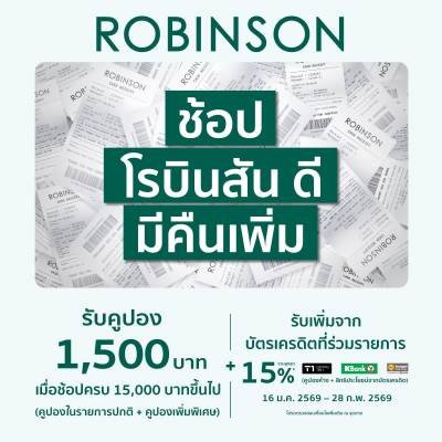 From January 23rd to February 1st, 2026, enjoy special promotions for only 3 days! From January 30th to February 1st, 2026, at all Robinson branches (except Jungceylon), get even more cashback with the “Shop Robinson, Get More Cashback” campaign, from now until February 26th, 2026 (excluding February 27th-28th, 2026) at all Robinson branches. You can also shop conveniently online through all of Robinson’s channels: Robinson Chat & Shop, Robinson Personal Shopper On Demand, Central App, website www.central.co.th 24/7, and Facebook Page: Robinson Department Store.