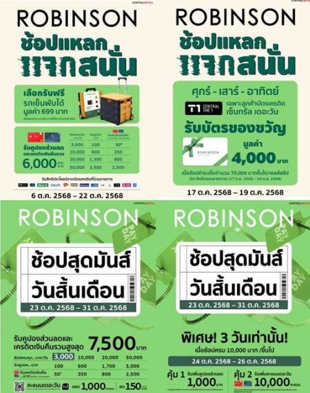 มาสัมผัสที่สุดแห่งความคุ้มค่าที่ห้างโรบินสันจัดให้ตลอดเดือน ต.ค. 2568 นี้ ที่ห้างโรบินสันทุกสาขาทั่วประเทศ และทุกช่องทางการช้อปปิ้งสุดสะดวกของห้างฯ ไม่ว่าจะเป็น Robinson Chat & Shop, Robinson Personal Shopper on Demand ผู้ช่วยช้อปส่วนตัวที่พร้อมดูแลทุกความต้องการ, Central App และเว็บไซต์ www.central.co.th https://www.central.co.th ตลอด 24 ชั่วโมง รวมถึง Facebook Page Robinson Department Store