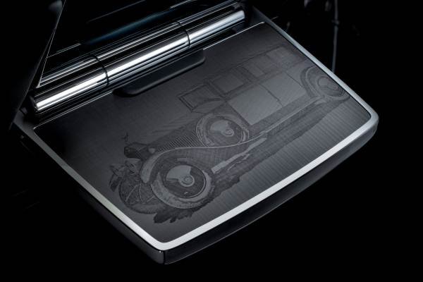 The woodwork is completed with depictions of the original 1925 Phantom I and the current Phantom VIII, individually etched on the rear picnic tables. The models are mirrored in embroidery on the leather-finished backs of the picnic tables – another gesture uniting past and present.