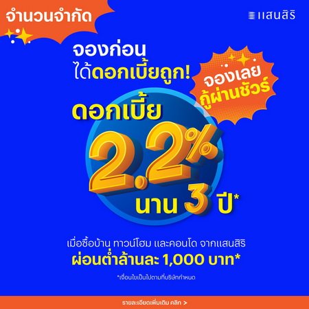 ในโครงการต่าง ๆ ของแสนสิริที่ครอบคลุมทั้งในกรุงเทพฯ และต่างจังหวัดทุกระดับราคาและความต้องการ รวมถึงบริการหลังการขาย หรือ Sansiri Service ส่งผลให้มีผู้ที่สนใจเข้าเยี่ยมชมโครงการที่อยู่อาศัยต่างๆ ของแสนสิริจำนวนมากและประสบความสำเร็จด้านยอดขาย ทั้งนี้ ล่าสุด แสนสิริยังได้ชูอัตราดอกเบี้ยที่ดีที่สุดในตลาดอสังหาฯ พร้อมเป็นรายแรกและรายเดียว ที่ให้อัตราดอกเบี้ยต่ำที่สุดในขณะนี้ด้วยอัตราดอกเบี้ยเพียง 2.2% เทียบกับอัตราดอกเบี้ยสินเชื่อที่อยู่อาศัยใหม่ เฉลี่ยอยู่ที่ 2.6-3.97% หรือภาพรวมอัตราดอกเบี้ยที่อยู่อาศัยอยู่ที่อัตราเฉลี่ยราว 3% ขณะที่อัตราดอกเบี้ยที่อยู่อาศัยมีแนวโน้มที่จะสูงขึ้นสอดคล้องกับภาวะเงินเฟ้อที่ส่งผลต่อต้นทุนวัสดุก่อสร้างและราคาที่อยู่อาศัยในอนาคต โดยแสนสิริ มอบดอกเบี้ยพิเศษ 2.2% นานสูงสุด 3 ปี* (จำนวนจำกัด) หรือผ่อนต่ำล้านละ 1,000 บาท* เริ่มเพียงเดือนละ 2,000 บาท* ในบ้าน ทาวน์โฮม คอนโดมิเนียม พร้อมอยู่จากแสนสิริรวม 69 โครงการทั่วประเทศ ตั้งแต่ระดับราคา 2-30 ล้านบาท พร้อมข้อเสนอพิเศษ ที่ทุกโครงการ พร้อมโอกาสสุดท้าย! บ้านเดี่ยว ทาวน์โฮม ลดเลยไม่ต้องลุ้น ลดเพิ่มทันทีสูงสุด 100,000 บาท คอนโดมิเนียม ฟรีส่วนกลางสูงสุด 5 ปี พร้อมอัตราดอกเบี้ยดี ถึง 30 เมษายนนี้