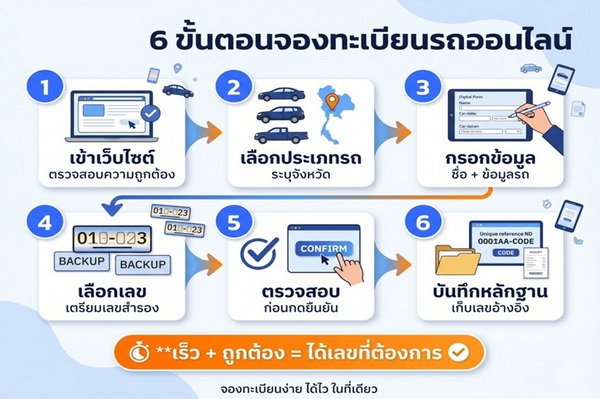 ในบทความนี้เหมาะกับคนที่เพิ่งออกรถใหม่ที่ยังไม่เคยใช้ระบบจองทะเบียนออนไลน์มาก่อน ซึ่งเราจะมีวิธีขั้นตอนในการจองให้ราบรื่นตั้งแต่ขั้นตอนของการเตรียมข้อมูลของเจ้าของรถ เลขทะเบียนสำรองไว้ล่วงหน้าเพื่อกันพลาด การเข้าใจขั้นตอนตั้งแต่ก่อนเริ่มจะช่วยลดความผิดพลาดระหว่างทำรายการและเพิ่มโอกาสได้เลขทะเบียนที่ต้องการมากขึ้น
