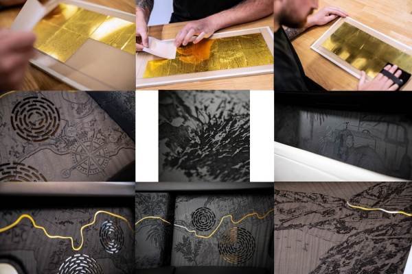 Once the wood sections were completed, artisans used 24-carat gold leaves to depict roads on the map section – each one a gold thread in Phantom’s story. Squares of gold leaf, typically just 0.1 micrometres (or 100 nanometres) thick, are hand-laid then sealed with a protective coating that achieves a hard-wearing, high-gloss finish. The ‘road’ is precision-cut and inlaid within the marquetry composition.