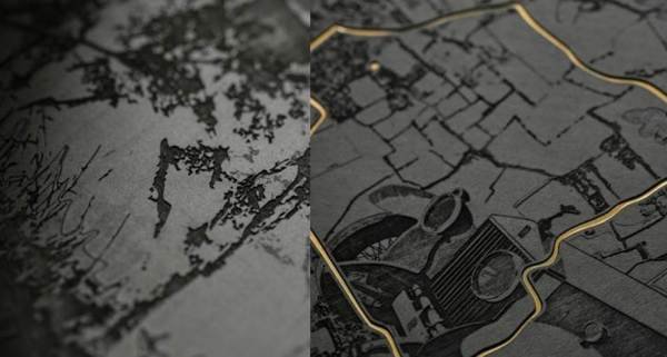 The design motifs, which include maps, landscapes, flowers and trees, are etched onto the wood at three different depths using a laser, each line of light and shadow carrying echoes of Phantom’s century of stories. Areas more deeply-etched into the wood appear to be darker, providing a contrast to the more reflective surface of the unetched veneer. This produces subtle shifts in colour and light, adding a sense of movement and texture beyond the linework.