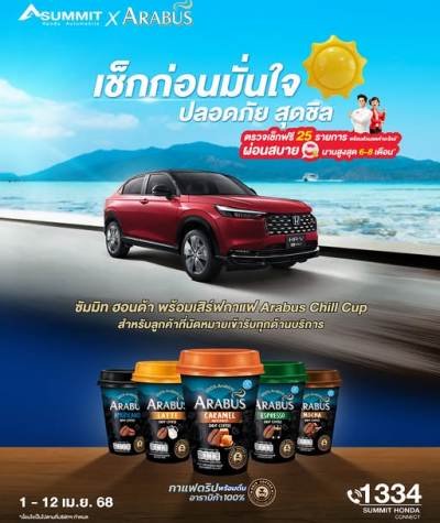 ซัมมิท ฮอนด้า จับมือกาแฟดัง ชูแคมเปญ ‘เช็กก่อนมั่นใจ ปลอดภัย สุดชิลล์’ รับฟรี ARABUS Chill Cup ถึง 12 เม.ย. นี้