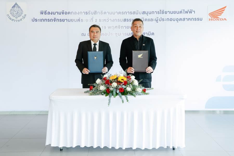 ไทยฮอนด้า ผู้ผลิตและจัดจำหน่ายรถจักรยานยนต์ และเครื่องยนต์อเนกประสงค์ฮอนด้าในประเทศไทยเข้าร่วมพิธีลงนามบันทึก “พิธีลงนามข้อตกลงการรับสิทธิตามมาตรการสนับสนุนการใช้ยานยนต์ไฟฟ้า ประเภทรถจักรยานยนต์ระยะที่ 2” ระหว่างกรมสรรพสามิตและผู้ประกอบอุตสาหกรรมอย่างเป็นทางการ เพื่อยกระดับอุตสาหกรรมยานยนต์ไฟฟ้าของประเทศไทยให้เติบโตอย่างแข็งแกร่งและยั่งยืน พร้อมทั้งผลักดันการใช้พลังงานสะอาด ลดการปล่อยคาร์บอน และขับเคลื่อนประเทศไปสู่เศรษฐกิจสีเขียว ตามวิสัยทัศน์ของฮอนด้าที่มุ่งสู่ Carbon Neutrality ภายในปี พ.ศ. 2593